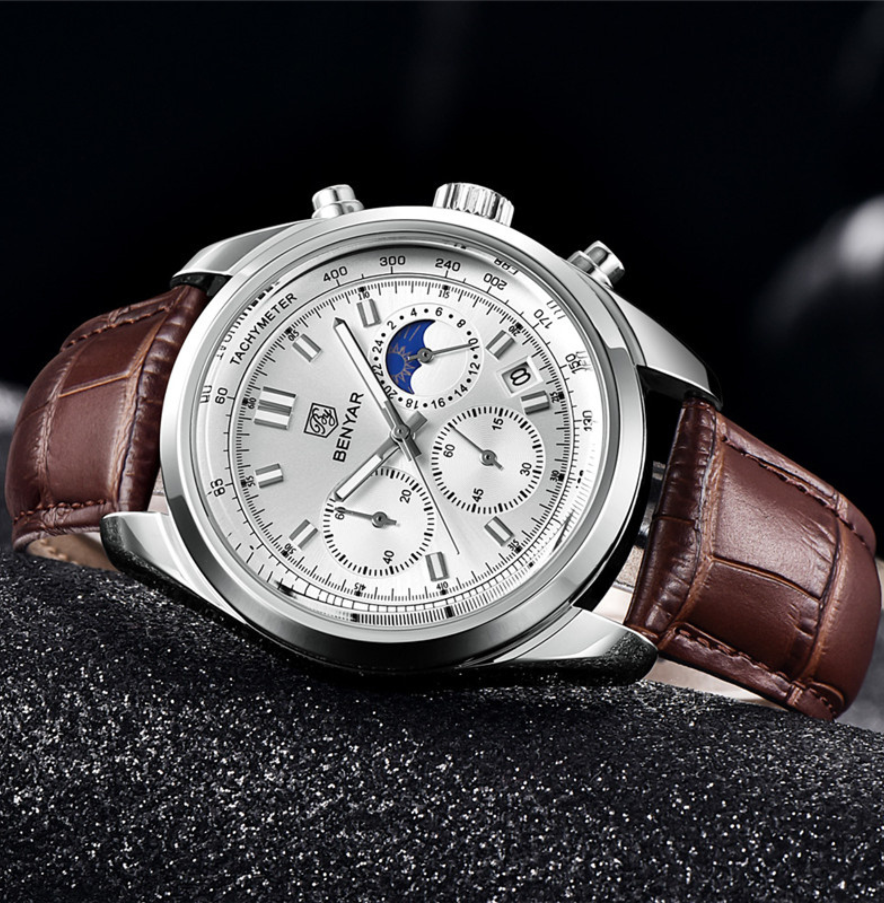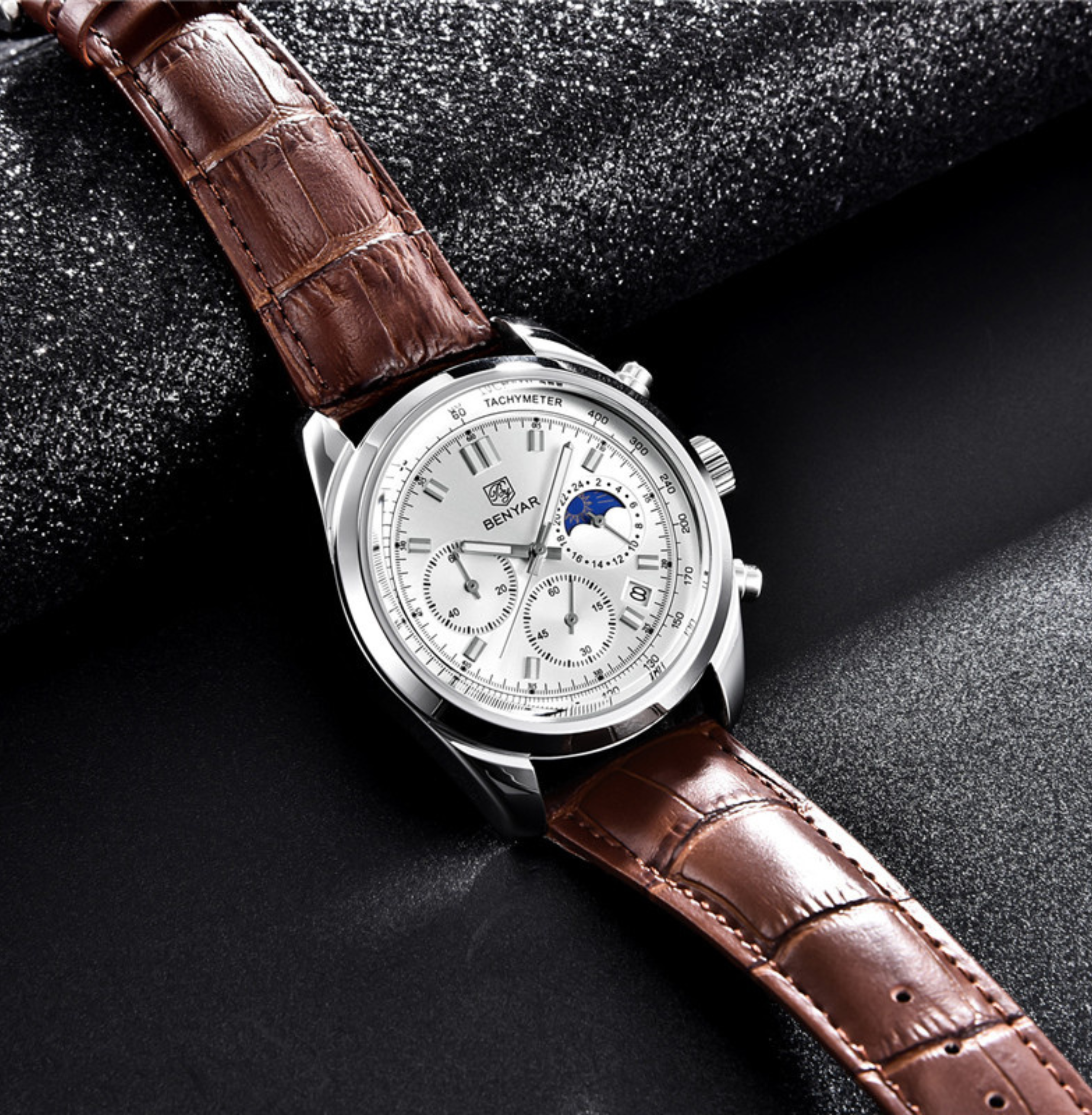🕒 Description générale La montre chronographe Benyar BY-5193A est une montre pour homme au style classique et élégant, idéale aussi bien pour les occasions formelles que pour un usage quotidien. ✨ Caractéristiques principales 🧭 Chronographe analogique – ajoute une fonctionnalité de mesure de temps (stopwatch). 👔 Design élégant et raffiné, adapté à toutes les occasions. 📏 Boîtier rond avec un diamètre d’environ 42 mm (standard pour une montre homme). ⌚ Mouvement à quartz précis pour une mesure fiable du temps. 💦 Résistance à l’eau jusqu’à 3 ATM (supporte éclaboussures légères/pluie, pas de baignade). 🪶 Bracelet en cuir noir confortable et élégant, largeur standard (~22 mm). 💎 Verre minéral ou hardlex anti-rayures, plus résistant aux rayures quotidiennes. 🗓️ Affichage de la date, pratique pour la vie de tous les jours. 📌 Style & Usage Cette montre combine un design classique avec des matériaux robustes, une élégance qui s’adapte aussi bien à un costume qu’à une tenue décontractée, et des fonctions utiles comme le chronographe et l’affichage de date.